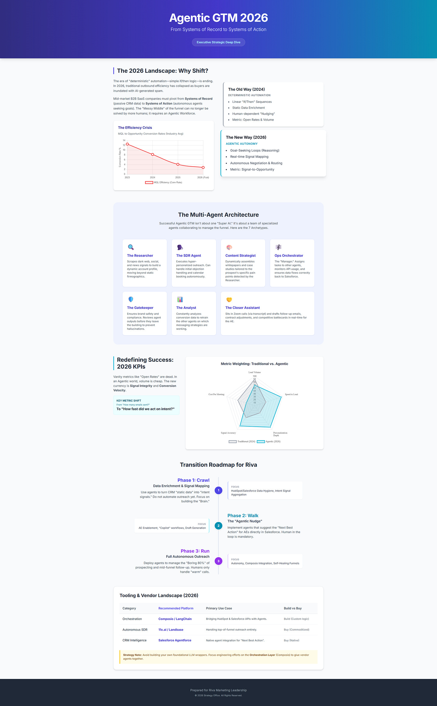 Conduct a comprehensive strategic deep dive into the “Agentic GTM” (Go-To-Market) shift, with a focused application for **Riva (rivaengine.com)**. The goal is to produce a report that defines the transition from traditional deterministic automation to autonomous, goal-seeking agentic workflows within a HubSpot/Salesforce environment.