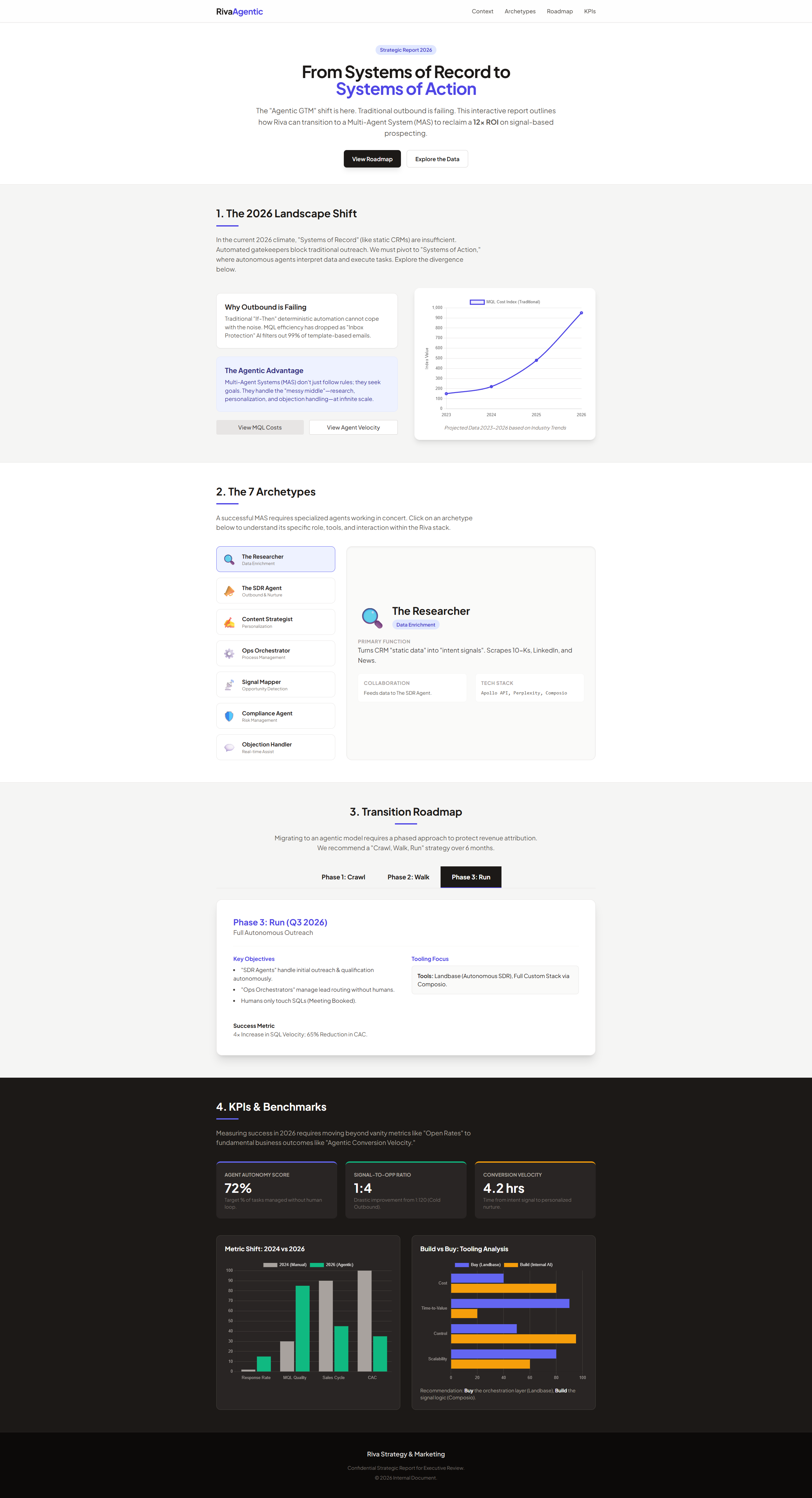 I am producing a report for Riva. Riva is a startup currently operating with a classic B2B stack: HubSpot for content/marketing automation and Salesforce for CRM. We are seeing the 2026 shift where “Systems of Record” (CRMs) are being replaced by “Systems of Action” (Agents). I need to demonstrate a phased transition plan that modernizes their GTM engine without disrupting their current revenue.